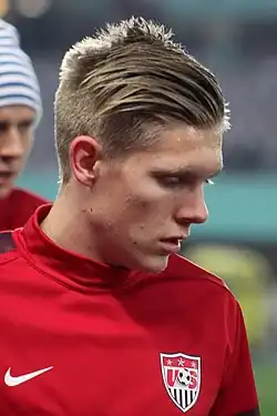Aron made his first appearance for the United States in their 4–3 friendly victory over Bosnia and Herzegovina in Sarajevo the next day, coming on for Eddie Johnson in the 63rd minute. In the final World Cup qualifying game against Panama on October 15, 2013, he scored his first goal in the final minute, securing a 3–2 win.[57] He was included on Klinsmann's 23-man squad for the 2014 FIFA World Cup, coming on for an injured Jozy Altidore in the 23rd minute of the opening game against Ghana for his tournament debut.