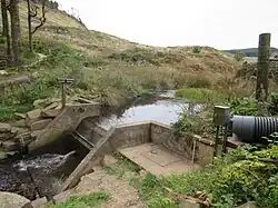 In order to access the intake sites, 2.6 miles (4.2 km) of road was built across the moorland. Material for its construction was obtained from whinstone quarries, opened up along the route, which saved the costs of obtaining the stone from further afield. Because of the nature of the terrain, one 1,300-yard (1,200 m) section floats on top of the peat and heather, and three bridges were built to cross streams. Construction work was restricted to the winter months, to prevent disturbing nesting hen harriers in the Special Protection Area. The road will continue to be used for maintenance purposes.[15]