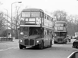 Palmers Green garage was opened in July 1912 by the London General Omnibus Company to house their bus fleet operating in competition in North London with Metropolitan Electric Tramways (MET) trams. Following World War II, the allocation at Palmers Green was made up of AEC Regent III RTs, Leyland Titan RTLs and RTWs and SRT class AEC Regent I rebuilds, making Palmers Green the only London Transport garage to be allocated all four standard buses of the London Passenger Transport Board's double deck types, although none could fit in the garage until the roof could be raised by 10 inches, which was completed in 1952 after a process taking 20 weeks.[31] The garage was further modernised in 1974, by which time 60 buses were allocated. AEC Routemasters arrived in 1969 replacing the RTs, but the RTs lasted there until 1978.[31]