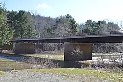 The second Arroyo Bridge (1901-2004),[2] a three-span, metal Pratt Truss bridge, 287 feet (87 m) long, built by the Nelson and Buchanan company of Pittsburgh and Chambersburg, Pennsylvania, crossed the Clarion River here. This bridge was built to replace the Arroyo Bridge Company's toll bridge, but now free of any tolls.[1] The bridge was such an important structure in the town that dances and parties were held on its deck during Arroyo's heyday. A consulting company was hired to design another replacement Arroyo Bridge in the 1990s; in 1992 the designing of a replacement bridge began. The design was approved in 2003 and its construction was completed in 2004, costing $2.3 million .[3]
