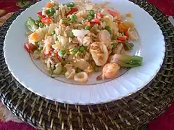 Arroz a la valenciana is a typical coastal dish in Colombia.[14] It usually includes pork or chicken, alongside fish and seafood. And it is mainly seasoned with saffron.