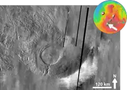 The shield is transected roughly northeast to southwest by a set of collapse features.[9] The collapse features on the shield are connected by a line of small shield volcanoes on the floor of the caldera. It is possible that this line represents a significant fault similar to others found on the Tharsis bulge. This fault may represent the source of the Arsia lavas.