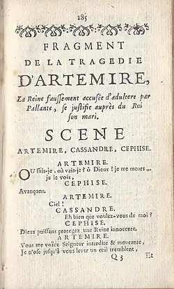 The publishers of the Kehl edition of Voltaire's complete works could not find a synopsis for the play, so their arrangement of the surviving fragments was based on a parody of Artémire listed in the Comédie-Italienne in an act by Dominique, only two days after the premiere.[1][3]