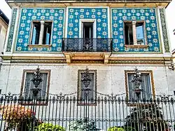 The Milan Universal Exposition of 1906 gave further impetus to the development of liberty, as dozens of pavilions were built in this style at the exposition site and numerous public buildings, thus decreeing the definitive consecration of liberty as the dominant artistic style in the city.[4] Although very articulated and differentiated, the Milanese art nouveau experience shows as a whole some common points and novelties: the decoration of buildings in wrought iron or decorative cement, with floral or animal themes is recurrent; at the structural level the use of reinforced concrete stands out. It is common the use of painting on the walls of the buildings, often with ceramic tiles, and the caryatids and hermas taken from the architecture of the Milanese noble palaces.[15] However, despite the very rich display of applied arts liberty developed in the city, architecture and interior decoration found it difficult to conform to the new style and except for a few episodes were dominated by late-eclectic styles.[16]