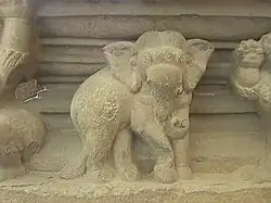 A sandstone guardian dvarapala is shown stomping on a bull, who in turn disgorges a small warrior. -