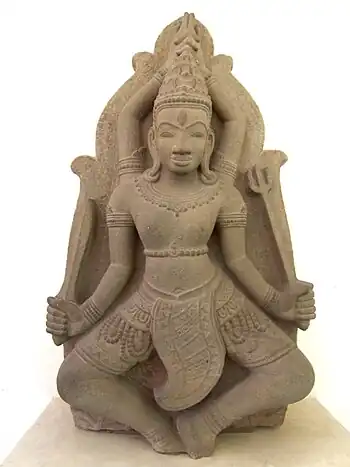 Another important work of the Mỹ Sơn E1 style is the unfinished sandstone pediment that was once affixed over the main entrance to the temple at Mỹ Sơn E1. The pediment shows the dawn of the present era according to Hindu mythology. Vishnu is reclining at the bottom of the ocean. His bed is Sesha the serpent. A lotus grows upwards from Vishnu's navel, and Brahma emerges from the lotus in order to recreate the universe.[18]