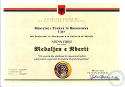 Artan Cuku Medal of Honor Certificate - ^ "Medalje Nderi pas vdekjes për Artan Cukun" [Posthumous Medal of Honor for Artan Cuku]. TV Klan (in Albanian). 14 June 2017. p. 1. Retrieved 14 June 2017.