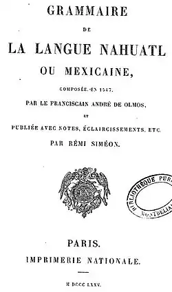 - ^ Andrès de Olmos (1875), Grammaire de la langue Nahuatl ou Mexicaine, Paris: Impr. Nationale