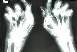 Arthritis mutilans is a rare medical condition involving severe inflammation damaging the joints of the hands and feet, and resulting in deformation and problems with moving the affected areas; it can also affect the spine.[1] As an uncommon arthropathy, arthritis mutilans was originally described as affecting the hands, feet, fingers, and/or toes, but can refer in general to severe derangement of any joint damaged by arthropathy.[2] First described in modern medical literature by Marie and Leri in 1913, in the hands, arthritis mutilans is also known as opera glass hand (la main en lorgnette in French), or chronic absorptive arthritis.[3][4] Sometimes there is foot involvement in which toes shorten and on which painful calluses develop in a condition known as opera glass foot, or pied en lorgnette.[5][6]