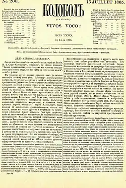 After leaving school Benni went to England to enroll at the technical college and, upon the graduation, joined the Woolwich arsenal as an engineer. By this time, in 1858 he became close to the circle of Russians in exile, led by Hertzen, Bakunin and Ogaryov.[1] Full of idealistic aspirations, Benni received the English passport and volunteered to go to Russia to investigate the revolutionary situation there (which was quite ripe, as his new friends were assuring him) and distribute Hertzen's Kolokol's latest issue he were to smuggle there. The self-proclaimed revolutionaries' sympathiser, a Russian merchant named Tomashewski who happened to be in London, agreed to accompany the 22-year-old Benni on his mission. In Berlin[7] Tomashewski declared that their ways from then on were to part, or either he'd report him to the police. Unthwarted, Benni, a load of Kolokol with him, found himself in Saint Petersburg in the summer of 1861,[1] still eager to "serve the great cause of Russian liberation."[6]