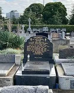 Calwell and his second wife had two children, Mary Elizabeth (b. 1934) and Arthur Andrew (b. 1937).[30] His son, known as Art, died of leukaemia in June 1948 at the age of eleven.[31] Calwell was profoundly affected by his son's death, and subsequently wore only black neckties. His wife later recalled it as "the cruellest blow Arthur has ever suffered. In fact, he has never been the same since that dreadful day".[32] Calwell's daughter was described by The Canberra Times in 1995 as his "most passionate defender and admirer".[33] In 2013, she published a sympathetic biography of her father titled I Am Bound to Be True, hoping to "correct what she believes is the maligning of his legacy".[34]