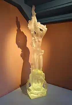 Fleishmann pioneered the use of perspex in sculpture, including some notable public pieces. In 1956, the Pacific Steam Navigation Company (PSNC) commissioned The Birth of Aphrodite for their ship Reina del Mar. Fleischmann carved the piece from a half-ton block of clear perspex built up from laminated sheets.[5] For the 1970 World Expo in Osaka, Japan, he created a perspex fountain for the British Pavilion, entitled Harmony and progress. In 1963, he featured in a British Pathe newsreel about perspex sculpture.[6]