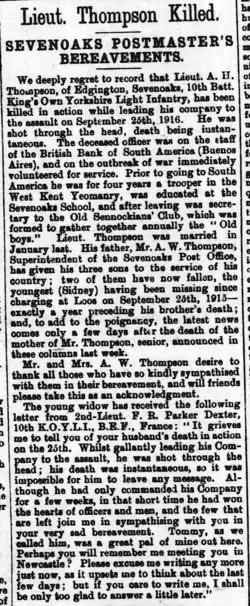 - ^ a b c "Lieut. Thompson killed". The Sevenoaks Chronicle. 6 October 1916. p. 6. Retrieved 25 April 2025.