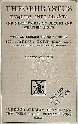 - (tr). Enquiry into Plants by Theophrastus (1916) (in two volumes). London: William Heinemann, and New York: G. P. Putnam's Sons.