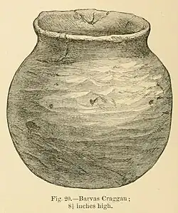 Mitchell's work with the Board of Lunacy required him to travel extensively in Scotland, and he took advantage of this to carry out research in archaeology and anthropology. He reported on several underground buildings,[13] and on a large collection of "rude stone implements" from Shetland.[14] The stone implements were found in a variety of locations: on the surface; in subterranean structures; in the heart of a large tumulus; outside a stone coffin; or inside a kistvaen. Mitchell pointed out that the relatively crude workmanship could indicate an early origin, but could equally represent more recent work as an old skill declined. He used a similar argument in describing some of his finds in the communities of the Scottish islands, for example spindle whorls, and craggans, unglazed and usually undecorated clay pots. Mitchell not only saw these in use, but in several cases saw them being made. He commented that if they were found in an archeological excavation they might well be thought to be from the Stone Age. He also recorded the customs and practices of the places he visited, in particular regional superstitions.[15] In 1876 he became the first Rhind lecturer, and described many of his findings in a series of six lectures, which were published as The Past in the Present: What is Civilisation?.[16] His conclusion was that the difference in the essential characteristics of modern and early peoples are imperceptible, that civilisation was due to accumulated knowledge rather than an inherent superiority of its individual members.