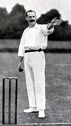 That December, at their annual meeting at Lord's, the captains of the first-class counties discussed the problem of throwing.[37] MacLaren asked those present at the meeting to give their opinion of Mold's bowling. According to MacLaren, they "replied to a man that they considered that Mold was not always fair".[40] Reports in the press stated that they voted by a majority of eleven to one that Mold's action was unfair,[38][41] and that along with other bowlers whose actions were suspected, he should not bowl in the coming season.[42] The captains further recommended that bowlers with illegal actions should be banned, suspended or warned depending on the severity of their transgression.[37] The meeting proved controversial, and disputes arose over how many captains had supported the decision.[42] MacLaren claimed that he was the only captain to support Mold.[40] Despite the verdict of the meeting, Lancashire's committee remained of the opinion that Mold bowled legally;[43] the Lancashire president A. N. Hornby and several of Mold's teammates also publicly backed the bowler.[44] Opinions among other players and in the press varied as to the fairness of Mold's bowling,[45] but sympathy was expressed for the damage to Mold's career and reputation,[46] while Pelham Warner suggested that it was unfair to ban Mold completely.[47] Some critics believed that the captains should not have passed judgement at all. The MCC, responsible for the laws of cricket and the organisation of the English game, were asked to adjudicate by several county committees.[42] Reluctant to let the decision stand, the MCC overruled the captains, preferring to leave the matter to individual umpires.[37][42] However, the umpires were instructed to pay close attention to suspect bowlers during the coming season.[10]