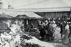 In 1906, Wohlmann was entrusted with organizing part of the Tourism Department's section at the Christchurch International Exhibition. Responding to visitors' expectations of spectacular attractions at the time,[49] Wohlmann designed and built a "wonderfully accurate copy of some of the most remarkable features of the thermal regions [... where,] after passing through a portal surrounded by carved Maori totem poles, the visitor is immediately transported to the land of soufrières, wai-arikis [hot springs], geysers and fumaroles".[50] This ingenious and faithful miniature recreation of "geyserland" was inaugurated by the Prime Minister, Joseph Ward, and earned Wohlmann his congratulations.[50][51]
