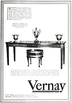 Born in Weymouth, England, Vernay was born to Louisa Stannard and Thomas Crabb Avant. Shortly after his parents divorced, he emigrated to New York in August 1904 and changed his surname from Avant to Vernay. He found a job as an elevator operator at a furniture store known as A.J. Crawfords and after working there briefly, Vernay started his own shop in 1906, called Arthur S. Vernay, Inc. located at 1 East 45th Street, near Madison Avenue. He also had a shop in London at 217 Piccadilly in the late 1910s to 1920s. He sold antiques and decorative artworks to a number of important and influential New Yorkers including Ogden Codman Jr., Elsie de Wolfe, Sir Charles Carrick Allom, Consuelo Vanderbilt, Francis Patrick Garvan, Benjamin Altman, Solomon R. Guggenheim, William Russell Grace, as well as leading art dealerships such as M Knoedler & Co, and the design firm Tiffany Studios.[1] From the 1920s to the early 1940s, he had a shop at 19 East 54th Street in New York.[2]