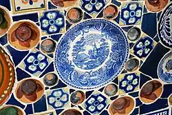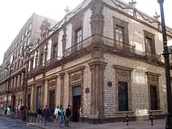 Talavera ceramic is mostly used to make utilitarian items such as plates, bowls, jars, flowerpots, sinks, religious items and decorative figures. However, a significant use of the ceramic is for tiles, which are used to decorate both the inside and outside of buildings in Mexico, especially in the city of Puebla.[18] The Puebla kitchen is one of the traditional environments of Talavera pottery, from the tiles that decorate the walls and counters to the dishes and other food containers. It is a very distinct style of kitchen. In monastery kitchens of the area, many of the designs also incorporate the emblem of the religious order.[19] Many of the façades in the historic center of Puebla are decorated with these tiles.[9][20] These tiles are called azulejos and can be found on fountains, patios, the façades of homes, churches and other buildings, forming an important part of Puebla's Baroque architecture.[21] This use of azulejos attested to the family's or church's wealth. This led to a saying "to never be able to build a house with tiles", which meant to not amount to anything in life.[2] Being able to show this kind of wealth was not restricted to Puebla. In Mexico City, the church of the Convent of La Encarnacion and the church of the Virgin of Valvanera both feature cupolas covered in Talavera.[22] The most famous example of Talavera in the capital city is the Casa de los Azulejos, or House of Tiles, which is an 18th-century palace built by the Count del Valle de Orizaba family. What makes this palace, in the City of Palaces, distinct is that its façade on three sides is completely covered in expensive, blue-and-white tile – sensational at the time the tiles were applied.[23][24]