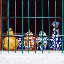 The Mexican pottery is a type of majolica (faience) or tin-glazed earthenware, with a white base glaze typical of the type.[2] It is made in the town of San Pablo del Monte in the state of Tlaxcala and the cities of Puebla, Atlixco, Cholula, and Tecali in the state of Puebla. Pottery is made in these locations because of the quality of the natural clay found there and the tradition of production which goes back to the 16th century.[3] Much of this pottery was decorated only in blue, but colors such as yellow, black, green, orange and mauve have also been used.[4] Majolica pottery was brought to Mexico by the Spanish in the first century of the colonial period. Production of this ceramic became highly developed in Puebla because of the availability of fine clays and the demand for tiles from the newly established churches and monasteries in the area. The industry had grown sufficiently that by the mid-17th century, standards and guilds had been established which further improved the quality, leading Puebla into what is called the "golden age" of Talavera pottery (from 1650 to 1750).[3] Formally, the tradition that developed there is called Talavera Poblana to distinguish it from the similarly named Talavera pottery of Spain. It is a mixture of Italian, Spanish and indigenous ceramic techniques.[2]