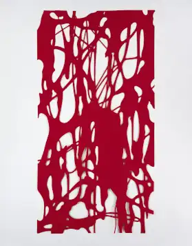 Herrera's large felt sculptures—first produced in 1998—suggested tactile, emblems of "heroic" Abstract Expressionist paintings with incised shapes resembling drips and splatters, while simultaneously deflating that movement with a pinned, slightly sagging appearance implying a fall from grace.[4][9][26] New York Times critic Roberta Smith described them as "melting, web-like abstractions … haunted by familiar ghosts that never declare themselves … [and] flirt openly with legibility."[7][56] In more cryptic felt works, large, solid forms obscured gestural areas, evoking themes of concealment and absence (At Your Side, 2001).[41][26] Later felt pieces took on simpler, figural qualities—some resembling flat, biomorphic surrealist sculptures (Orfeo, 2007), and others, garment-like forms that drooped from walls or crumpled on the floor (Felt #19, 2009).[10]