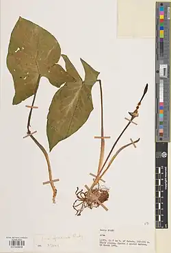 It has discoid tubers with dimensions 3–5 centimetres (1.2–2.0 in) × 1–3 centimetres (0.39–1.18 in).[2]
