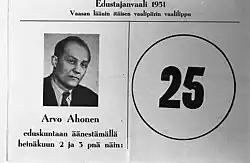 Arvo Ilmari Ahonen (27 January 1918 – 16 June 1991) was a Finnish politician, born in Multia. He was a member of the Parliament of Finland from 1951 to 1979, representing the Social Democratic Party of Finland (SDP). He was a presidential elector in the 1956, 1962, 1968, 1978 and 1982 presidential elections.[1]