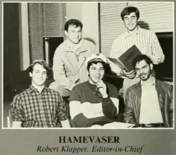 While at YU, Klapper served as editor-in-chief of Hamevaser newspaper, editor-in-chief of Gesher journal, president of the English Honors Society, and co-chair of the Committee to Preserve Revel.[6][23][24][25]