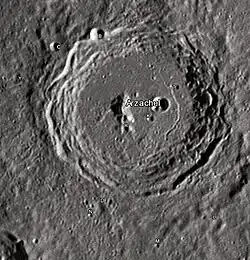 Arzachel is a Latinization of the name of the Arab astronomer and mathematician Abū Ishāq Ibrāhīm al-Zarqālī.[2] Like many of the craters on the Moon's near side, Arzachel was named by Giovanni Riccioli, whose 1651 nomenclature system has become standardized.[3] Earlier lunar cartographers had given the feature different names: Michael van Langren's 1645 map calls it "Annae, Reg. Fran.", after Anne, the Regent of France,[4] and Johannes Hevelius called it "Mons Cragus" after one of the Mount Craguses of the ancient world.[5]