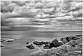 At low tide, there is access to a sand deposit delimited by a rocky wall made from slate and schist forming 30 metre arches resembling cathedral flying buttresses, large caves, sand corridors between rocky blocks, and other geological features. Particularly low tides create access to nearby beaches through the sand extension. As the coast stretch is almost horizontal, the water covers the beach again very quickly.