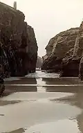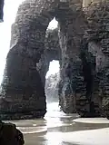 Praia das Catedrais (Spanish: playa de las Catedrales, English: Beach of the Cathedrals) is on the northwest coast of Spain. It is the name given by the tourism industry to Praia de Augas Santas (translated from Galician: 'Beach of the Holy Waters'). The beach is located in the Ribadeo municipality, in the province of Lugo (Galicia), on the Cantabric coast, and it lies about ten kilometres to the west of the town of Ribadeo. Its name is derived from its cliff formations.
