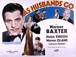 As Husbands Go is a 1934 American pre-Code comedy film directed by Hamilton MacFadden and written by S. N. Behrman and Sonya Levien. It is based on the 1931 play As Husbands Go by Rachel Crothers. The film stars Warner Baxter, Helen Vinson, Warner Oland, Catherine Doucet, G. P. Huntley, Frank O'Connor, and Eleanor Lynn. The film was released on January 27, 1934, by Fox Film Corporation.[1][2][3]