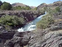 The river has its source in the Karatau Mountains. It flows through lakes Bilikol and Akkol.[1] Further downstream it vanishes in the Muyunkum Desert before reaching the river Talas. The river is 253 kilometres (157 mi) long and has a basin area of 9,210 square kilometres (3,560 sq mi).[2]