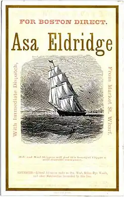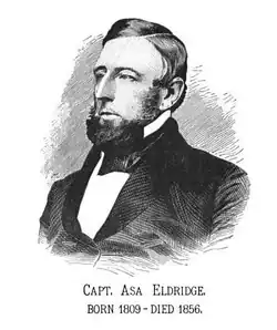 Asa Eldridge (1809–1856) was a sea captain from Yarmouth, Massachusetts. In 1854, Captain Eldridge guided the clipper ship Red Jacket from New York and to Liverpool in only in 13 days, 1 hour, and 25 minutes, dock to dock, setting a speed record for the fastest trans-Atlantic crossing by a commercial sailing vessel that has remained unbroken ever since.[1][2][3] In 1856, Captain Eldridge skippered the ill-fated steamship SS Pacific, which disappeared at sea on a voyage from Liverpool to New York.[1][2][3]