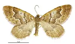 The expansion of the wings is 1+1⁄8 inches. All the wings are ochreous, the forewings being strongly tinged with reddish on the costa and extreme base; the median band consists of four very irregular faint blackish lines, the second and third lines forming three distinct loops; there is a distinct blackish discal dot and the outer edge of the median band is very strongly waved, with distinct projections above and below the middle; the subterminal area is broad with one or two very faint cloudy marks; all the wings have a terminal series of minute brown marks, and all the cilia are plain ochreous without bars. The underside of the hind-wings is dull reddish-ochreous without bars. The underside of the hind-wings is dull reddish-ochreous without distinct markings.[5]