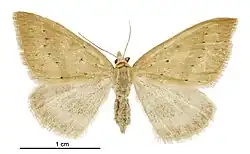 Male, female. — 28-30 mm. Head, palpi, antennae, and thorax very pale brownish-ochreous. Abdomen ochreous-grey-whitish. Legs whitish-ocbreous, anterior femora and tibiae dark fuscous above. Forewings with costa gently arched, posteriorly more strongly, hindmargin slightly bowed, rather oblique; very pale glossy brownish-ochreous; four series of minute black dots on veins; first near base; second at 1⁄3, curved; third from 3⁄4 of costa to 2⁄3 of inner margin, rather prominent in middle, preceded by a cloudy fascia slightly darker than ground-colour; fourth subterminal; a minute black discal dot; hindmarginal space sometimes slightly darker : cilia whitish-ochreous, tips paler. Hindwings ochreous-grey-whitish; a cloudy indistinct pale fuscous hindmarginal fascia, containing a dentate subterminal line of ground-colour; cilia pale whitish-ochreous.[3]