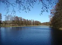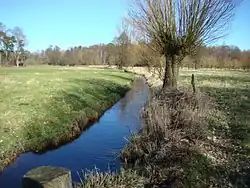 After leaving the Loher Ponds, the Aschau picks up the Dallebach and flows in a generally southerly direction, first through the Aschau Ponds. It passes under the B 191 federal road, is joined from the left by the Postmoorgraben, and then flows through extensively managed meadows and natural, original forest to Eschede, before continuing to Habighorst. It then picks up the Quarmbach from the right, a stream which rises in Rahmoor, and which forms a large swamp and lake area just before its confluence with the Aschau. Just north of this area is the Hoppenrieth Nature Reserve.[3] By the 15th century the Quarmbach had been impounded to drive the local mill, the Quarmühle and some of the ponds must date back to that period. In the 1980s the mill fell into disrepair and later burned down. The Aschau continues past the abandoned Mariaglück potash mine.[4] and on to Höfer. It flows south through Beedenbostel and discharges shortly afterwards into the Lachte.