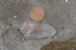 Ascidiella aspersa, the European sea squirt, is a species of solitary sea squirts native to the northeastern Atlantic, from the Mediterranean Sea to Norway. They possess oval bodies up to 50 to 130 mm (2.0 to 5.1 in) in length. Their branchial (or oral) siphons are conical and positioned at the top of the body. They possess six to eight lobes. The atrial siphons are located at the upper third of the side of the body and possess six lobes. The body is covered by a firm transparent test that is greyish to brown in color. The test often snag detritus that remain loosely attached to the animal. When expanded, at most 40 tentacles can be observed on the inside surface of the branchial wall. Both the openings of the branchial and atrial siphons possess lighter colored ridges on their rims. They may also be frilled at times. A. aspersa are attached to the substrates by the left side of their bodies. They can be found in dense groups of unfused individuals on hard surfaces like rocks. at depths of up to 90 m (300 ft).[2][3][4][5]