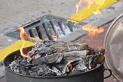 "Burning of joss paper accounted for up to 42% of the atmospheric rBC [refractory black carbon] mass, higher than traffic (14-17%), crop residue (10-17%), coal (18-20%) during the Hanyi festival in northwest China", according to a 2022 study, "the overall air quality can be worsened due to the practice of uncontrolled burning of joss paper during the festival, which is not just confined to the people who do the burning," and "burning joss paper during worship activities is common in China and most Asian countries with similar traditions."[12]