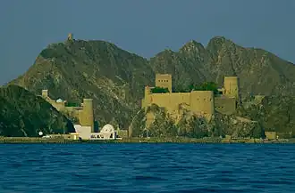 - ^ The modern city of Muscat lies about 4 kilometres (2.5 mi) to the west of the port of Old Muscat and its neighboring port of Muttrah, and greater Muscat extends further westward along the coast.[5]