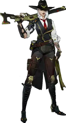 Ashe stands 5 ft 6 in tall,[10] and is a woman with red eyes and white hair cut into an asymmetrical bob cut, covered by a black wide-brim cowboy hat. She wears a white long sleeve shirt with the sleeves rolled up, a red tie, and a black long tailed vest with her gang's logo on the back. Her gray pants are covered by leather armor from the upper thighs to the knees, with metal knee guards linking them to her black boots. Her right arm is covered by armor to the wrist, while her left forearm has a visible gray tattoo of her gang's logo along its length, with fingerless gloves covering both hands. In addition, a pouch is strapped to her right thigh, while an angled belt holds grenades at her right hip. Her weapons consist of a gold engraved lever action rifle with a notched stock, and a sawed-off double barrel shotgun.[3] Her design was changed slightly for Overwatch 2, giving her a full opened jacket with red accents and an armored vest underneath.[11]