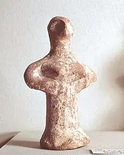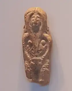 Asherah's association with fertility was not limited to her association with trees; she was often depicted with pronounced sexual features.[35] Images of Asherah, often called ’Astarte figurines’, are representative of Asherah as a tree in that they have bodies which resemble tree trunks,[36] while also further extenuating the goddess' connection to fertility in line with her status as a "mother goddess". The "Judean pillar figures" universally depict Asherah with protruding breasts. Likewise, the so-called Revadim Asherah is rife with potent, striking sexual imagery, depicting Asherah suckling two smaller figures and using both of her hands to expose her vagina fully.[37] Many times, Asherah's pubis area was marked by a concentration of dots, indicating pubic hair,[38] though this figure is sometimes polysemically understood as a grape cluster.[35] The womb was also sometimes used as a nutrix symbol, as animals are often shown feeding directly (if a bit abstractly) from the pubic triangle.[39]