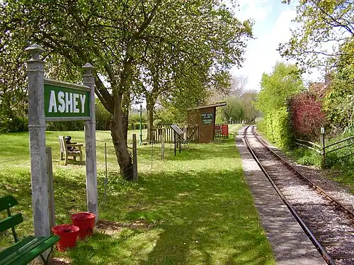 Ashey railway station is a station serving the village of Ashey on the Isle of Wight in England. It was on the line which ran from Ryde to Newport. It has a passing loop when built but this was taken out of use when a loop was provided at Havenstreet instead. The substantial station buildings were abandoned in BR days due to subsidence of the main platform, with the line moved to the opposite platform.