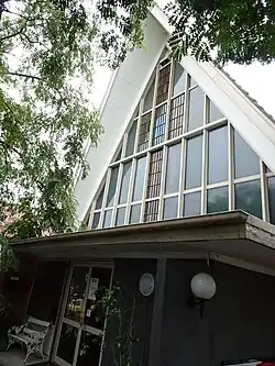The former church (1962) is an A-frame building standing with its long sides parallel to Ashgrove Avenue on the highest part of the site. It is single-storey and its roof has a sloping ridgeline, taller and wider at its front (southwest gable end), where the former church's main entrance is. The steeply pitched main roof is clad in green-coloured cement tiles with eaves extending low to the ground on both sides. The shape is formed by metal portal frames, which extend from below the eaves clear of the exterior walls and meet the ground on concrete footings. Both gable ends of the building have face brick walls and are glazed, with the front featuring a coloured glass cross pattern. The side walls on the southeast are face brick, the northwest walls are clad in timber vertically jointed (VJ) boards and the subfloor is enclosed by hit-and-miss concrete blocks.[1]
