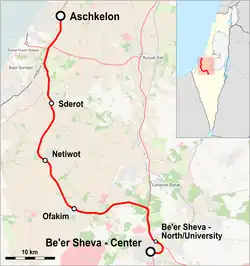 The Ashkelon–Beersheba railway is a railway line linking Ashkelon and Beersheba operated by Israel Railways.[1] It spans approximately 60 km of double track in the northern Negev region of southern Israel and provides rail service to the cities of Sderot, Netivot and Ofakim. The line links Beersheba, Sderot, Netivot, and Ofakim to Ashkelon and Tel Aviv.