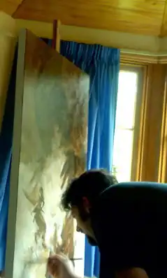 Wood generally works in mixed media, often combining oil painting with digital artmaking.