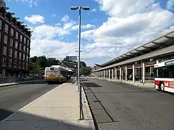 In September 2004, the MBTA began reconstruction of the 75-year-old station, then expected to cost $44 million.[13] The MBTA awarded the $35.2 million main construction contract on June 9, 2005.[14] The reconstruction included demolition of the existing station, the addition of two fare lobbies over the ends of the station, and a new busway at the fare lobby level. Elevators were added to make station fully accessible, and direct access from Peabody Square (removed in the 1970s renovation) was added. The Ashmont–Mattapan line loop was moved to a new viaduct at the south end of the station, with a platform near the south fare lobby; the former cross-platform transfer was eliminated.[14][15]