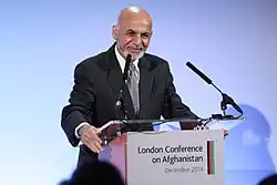 In 2014, Ghani became president after winning the controversial 2014 Afghan presidential election. The election was so disputed that negotiations between Ghani and rival Abdullah Abdullah were mediated by the United States. Ghani became president and Abdullah chief executive, with power split 50-50.[4][5] On 18 February 2020, Ghani was re-elected after a delayed result from the 2019 presidential elections.[6][7] He was sworn in on 9 March 2020.[8] As president, Ghani was known for his intensity and energetic speeches.[9] He aimed to transform Afghanistan into a technocratic state, winning him support from youth and urban demographics.[10] His cabinets were relatively young and well-educated. Ghani made efforts to make peace with Taliban insurgents[11] and improving relations with Pakistan.[12] However many of his promises, such as fighting corruption and turning the country into a trade hub between Central and South Asia, were left unfulfilled.[10] His position was also weakened by political rivalries,[10] his attempt to lessen the power of ex-warlords,[13] and an uneasy relationship with the United States regarding the war.[11] He was also criticized for being aloof and short-tempered, including being in denial during the Taliban's offensive in 2021.[10][14][15]