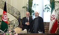 Since his election, Ghani wanted to improve relations with Pakistan, which in turn could pave the way for peace talks with the Taliban. He refused to recognize the border with Pakistan, known as the Durand Line, which Pakistan views as an existential issue.[55] He made his first visit to Pakistan on 14 November 2014, meeting Prime Minister Nawaz Sharif.[56] However, after many terror attacks in Afghanistan which were largely blamed on Pakistan, and failed Taliban peace talks, Ghani grew increasingly cold to Pakistan.[57] Ghani claimed that Pakistan had hit an "undeclared war of aggression" against Afghanistan.[58] Following two deadly Taliban/Haqqani attacks in Kabul in January 2018, Ghani called Pakistan the "center of the Taliban".[59] Tolo News while quoting an unnamed source alleged that Ashraf Ghani had refused to take a call from the Pakistani prime minister, instead he sent a NDS delegation to hand over evidence that the terrorists were supported by Pakistan.[60] However, Afghan envoy Omar Zakhilwal rejected such reports regarding Ghani's phone call rejection with Pakistan prime minister. He stated that no phone call took place between the two leaders and that such reports are baseless.[61] At a July 2021 conference in Tashkent, Ghani accused Pakistan of fomenting violence in Afghanistan through the Taliban; Pakistan accused Afghanistan of helping insurgent groups inside Pakistan (the Tehreek-e-Taliban and the Balochistan Liberation Army).[62]