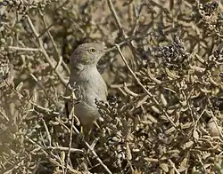 The Asian desert warbler (Curruca nana) is an Old World warbler which breeds in the deserts of central and western Asia and the extreme east of Europe (Volga Delta area east to western Inner Mongolia in China), and migrating to similar habitats in southwestern Asia (Arabia to northwestern India) and the far northeast of Africa (Red Sea coastal regions) in winter. Until recently it was considered conspecific with the African desert warbler (and called just "desert warbler"),[2] but is now given specific status.[3][4] The two are still each other's closest living relatives, and their relationships to other typical warblers are not clear. They may be fairly close to the common whitethroat; particularly, female whitethroats look much like a richly coloured Asian desert warbler. But it seems that all these three taxa are fairly basal members of the genus.[5][6]